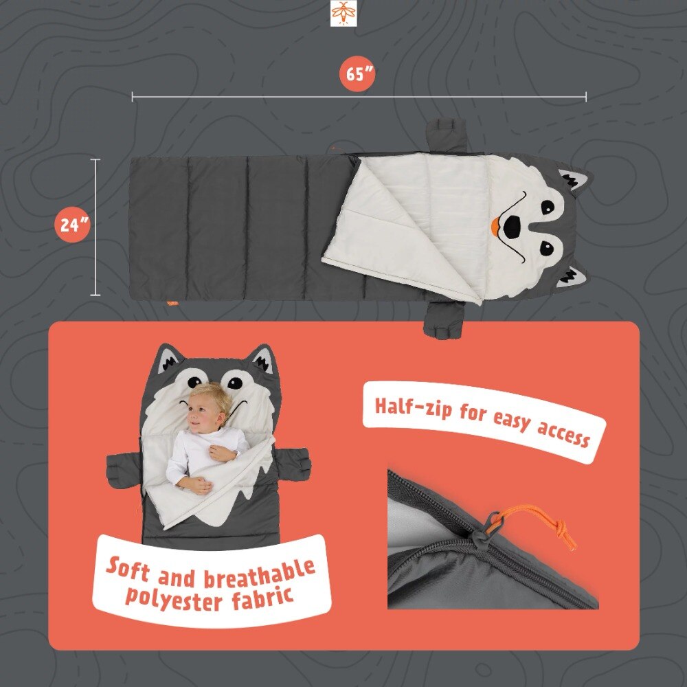 The campsite just got a whole lot brighter with the Aspen the Wolf Kid’s 3 Piece Camping Combo Set. The set includes a duffel bag, sleeping bag, and lantern which is perfect for any indoor or outdoor camping adventure. The sleeping bag is made with soft and breathable polyester fabric. The colorful character duffel bag is perfect for your child’s next campout, sleepover, or backyard adventure. The duffel bag perfectly fits the included sleeping bag and lantern and has exterior pockets on the front and back. The lantern has a durable soft plastic globe and lifetime LEDs that will withstand even the roughest adventures. Step up your next outdoor adventure with the Firefly! Outdoor Gear Aspen the Wolf Kid’s 3 Piece Camping Combo Set. Check out all that has to offer and collect the whole set!